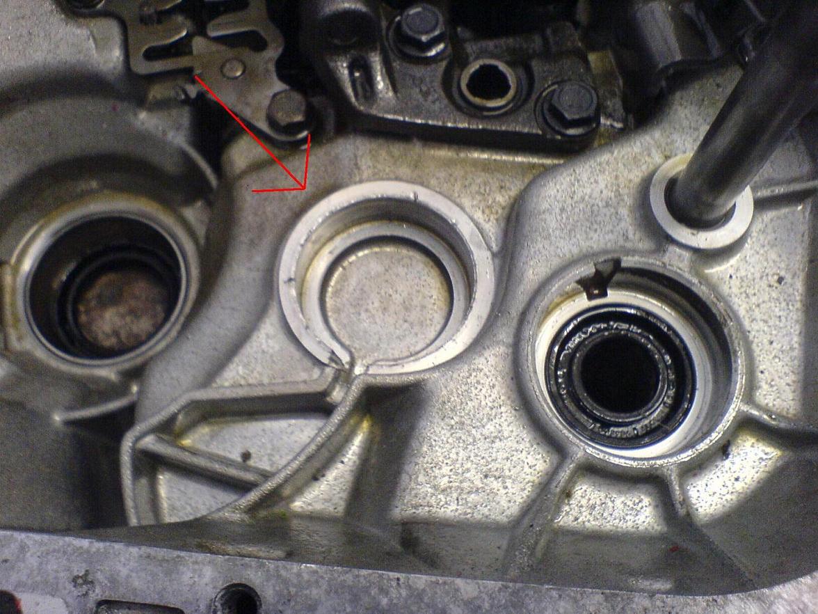 I min gearkasse på min ford rs turbo har jeg et leje som sidder lige løst nok så når jeg har kørt nogle måneder går det i stykker og æder hovede akselen det er jeg ved at være lidt træt af. Er der nogen der har en ide til hvordan jeg kan få det sat ordenligt fast i gearkassen. Jeg har taget et billede og makeret det med en rød pil. kan man få en bøsning man presser lejet ned sammen med eller noget.